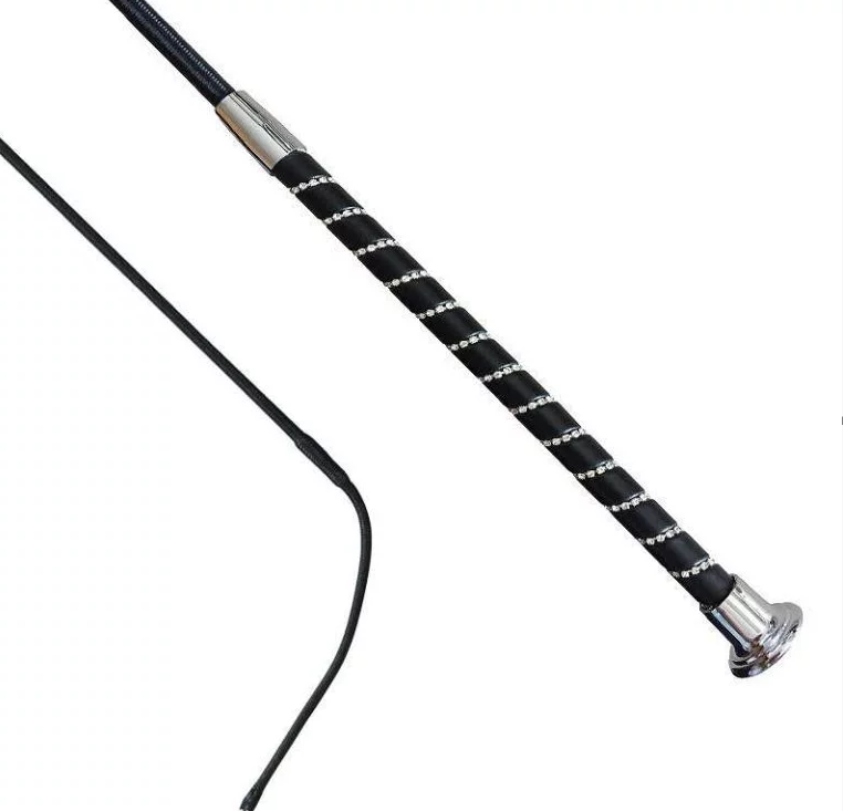 Bonita fusta de doma de aspecto súper lujoso. Mango con remate metálico decorado con espiral de piedras brillantes.
