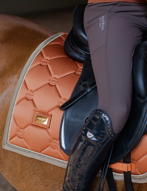 Exclusiva mantilla de silla con un precioso diseño en naranja cálido y detalles en dorado y beige champán. Decorada con el elegante emblema dorado de Equestrian Stockholm. Confeccionada en un material brillante y resistente a la suciedad, transpirable y que mantiene a tu caballo seco durante las sesiones de entrenamiento. La mantilla está acolchada con el patrón característico de Equestrian Stockholm. Combínala con otras piezas de la misma colección para un look completo.