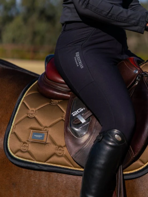 Combina el arte del diseño ecuestre con la funcionalidad más exigente. Su tono dorado brillante aporta una distinción única, reflejando la armonía entre caballo y jinete. Diseñada para reflejar la armonía entre caballo y jinete, combina un brillo dorado exclusivo con la funcionalidad más exigente. ?? Material brillante que repele la suciedad y mantiene su aspecto impecable. ?? Interior de secado rápido para mayor confort durante las sesiones más intensas. ?? Forma anatómica que ofrece un ajuste perfecto y equilibrio total. ?? Acolchado elegante con el icónico estampado de Equestrian Stockholm. ?? Ribetes dorados que aportan un toque de distinción inconfundible.