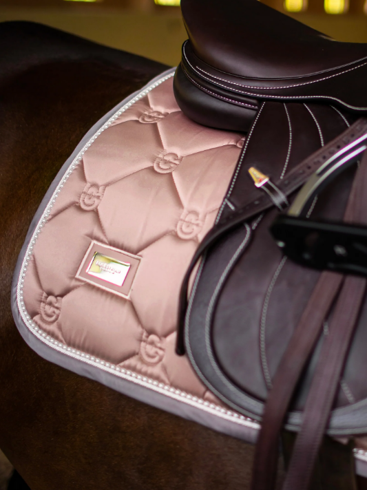 Esta mantilla rosa es una elegante mantilla con detalles en blanco y gris. Está diseñada con preciosas perlas en el borde y decorada con el emblema de la Federación Ecuestre de Estocolmo en plata.