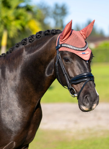 Orejeras de ganchillo de lujo en un elegante color rosa coral. Decorado con un parche de satén rosa coral en la parte delantera, un precioso ribete rosa coral y el emblema de la Federación Ecuestre de Estocolmo en plata. La red orejera ofrece protección contra insectos y reduce el ruido. Incorpora tela elástica en las orejas para mayor comodidad.
