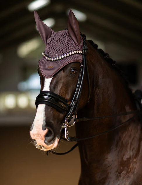 Orejeras de ganchillo de lujo en un elegante color marrón/morado. Decorado con un parche de satén marrón/morado en la parte delantera, un precioso ribete y un borde en el mismo tono. Luce el emblema de Equestrian Stockholm en oro rosa. El gorro ofrece protección contra insectos y reduce el ruido. Incorpora tela elástica en las orejas para mayor comodidad. Esta orejera combina a la perfección con la mantilla de la colección Moonless Night.