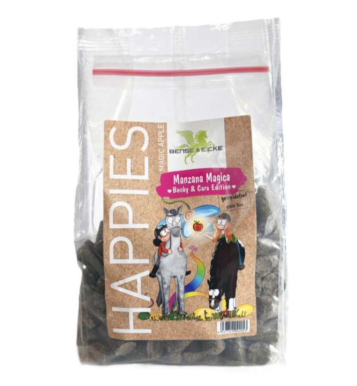Manzana mágica: 40,0% fruta (manzana), 30,0% harina de alfalfa verde, 10,0% melaza, 5,5% carbonato de calcio, 5,0% extracto de semilla de girasol, 5,0% extracto de semilla de lino, 4,2% melaza de remolacha, 0,1% manzanas deshidratadas